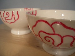 とうとう、アール・デコのバラ、シリーズ化 決定!このモチーフはジャニー先生も気に入ってくれて先日、先生の花瓶のモチーフにも使われ、なんだかうれしかったです。もちろん先生のアレンジを加えての作品で さすが! でした。 このままでもいい感じだな~モチーフが単純なだけに配置に迷ったけど、なんとか下絵が完成!赤い色は「Vernis de reserve」 でマスキング液で、塗りたくない場所に描いておきます。後からソレを剥がせばそこだけ白色や残したい色になるわけです。いつも、このVernis...の赤色が絵の具で出せたらな~って思いますが、この色のように、特に 赤色 は思ったような色になりません。まだヨーロッパではカドミウム入りの絵の具が禁止になっていなくてとても鮮やかな色に仕上がるのですが、ご存知の通り 「毒」 です。食器の使用はもちろん避けています。混ざると嫌なので、カドミウム入りの絵の具を買わないようにしていますが、1つだけ私の絵の具に混ざっていてビックリ。その色は私の中では使用禁止!さあ、下絵が出来たらこの後の仕事は速いですよ~!食べるのも寝るのも忘れるって感じです。