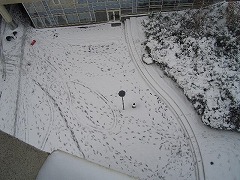 昨日からチラチラ降り続いた 雪 が10センチくらい積もった。 足跡とソリの跡がとてもきれい朝、外を見るとこのくらいの雪!リヨンにしたら 大雪だ! suzuranさんの家にお邪魔する予定だったのがこの雪のためバスが運休するかもしれなくて、予定は延期に…。「このくらいの雪で~?」 と雪の降る街の人からみると不思議ですがね~!昔、幼稚園の3歳の子供たちに 「雪が降ってきたよ」 「歩いてみようか!でも雪が積もっているからね~」…など言葉がけはシンプルに、そして「こう歩きましょう」など行動を押し付けなくピアノの音にあわせて即時反応を身体で表現するといったリトミック(音楽教育法の一つ)を教えていました。この世に生まれて3年。まだ冬を味わって3回(もしかして2回の子も)なのに、幼稚園の遊戯室の天井を見上げて落ちてくる雪を想像しながら、顔に落ちてヒヤッとした感覚や、足の指の先まで神経を使って歩く様子がまるで雪道の歩き方。見ていてとても面白い!それぞれの感じ方が違うから表現もそれぞれ。友達の表現を真似する子がいてもよし!それがその子の選んだ表現なのでよし!いきなり、ピアノをグリッサンド(高音から低音を指で滑らす)。たちまち雪で滑ったようにみんなは転ぶんだけど(もう、すっかりと雪の世界に入っている…)その転び方もさまざま。転びなれていない子や、やんちゃで転びなれている子。私はやんちゃな子だったので、痛い目にいろいろあっていた…。転んで痛い目にあい、うっかり怪我でもしたら親に怒られたので、2度は痛い目にあう。はははこれらの感覚が何に役立つか…はわからないけど、感性ってこういう身近な生活や環境の中から育つ物なのかも。。。いつか、大人になってそれを意識したときにまた何か新しい発見がありそうです! アパートの下で遊ぶ親子をズームしてみると、雪ダルマを作っていた。何だか、頭が小さいような…「後から見に行こう!」と思っていたらなくなっていた。どうやらソリに乗せて持って帰った模様…ソリで運ばれる様子を見たかったよ~あ~、残念。でももしかしてお父さんが抱えて帰った?ん~、それはないだろうな~。行方不明になった雪ダルマをいろいろ想像してしまった…。