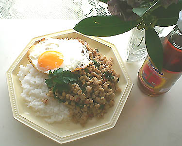 日曜日の朝は、母ちゃんの墓参りに行ったのス(・w・)b その後、渋谷にお買い物に行ったんだけど・・・ 東京マラソンで、通行止めになってるじゃん(;´Д`)ノ ってことで、高速で行く事に~b いや~(´(ェ)`;)ゞ 買い物しまくって来ましたっヾ(o゚ω゚o)ノ゙ そうそう。 タイトルは『エスニック』だったよねw 今日のお昼は、タイ料理の『ガパオ』を作りましたb 去年、お友達のあんこちゃん家に泊まらせて頂いた時、 あんこちゃんのママンが作ってくれて以来、 ハマリにハマって、我が家の定番料理になったのス~( *´艸)( 艸`*)ププッ ガパオってのは、タイ語でバジルのことみたいb 写真↑は、 ひき肉をナンプラー、かき油、赤唐辛子、ニンニク、バジル等で炒めたんですYO! タイ料理って好きなんだけど、 ダーさんも友達も苦手らしくて、一緒に行ってくれないんだよー(゚ ωÅ)ホロリ 一人で食べに行く勇気は無いしさ~(´д`) ・・・誰か私と一緒に行ってくれませんか(;▽;)?(願 んではでは、シフォたんは又明日っ(何っ 終わりんぬぅ(○・ω・)ノ-------------end-------------