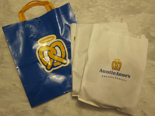 世界中で大人気だというソフトプレッツェル『アンティ・アンズ』。コトチカ京都店に できた時、行列がすごくて驚きました ^^ゞ1回行列に並んだのですが、あともう 少しというところで気分が悪くなり断念して帰った私。。。この前、京都駅に行っ た時、随分列が短かったので並んでみました(^-^)注文してからも中で待たされ たのですが、それでも合計15分程でした。前に買った事があるような感じの人 がアーモンドが美味しいと言うのが聞こえてきたので、アーモンドとメープルと オリジナルを買ってみました(^-^)/ オリジナル プレッツェル☆220円♪ アーモンド クランチプレッツェル☆250円♪ メープル プレッツェル☆280円♪ メープルだけ5分ほどお時間くださいということだったので、待ちました ^^* 熱々の出来立てメープル♪出来立てをその場で食べるのが美味しいのだ と思いました。私は家に帰ってその日の夜に食べました。冷めてしまった時 の温め方が袋に書いてあったので、その通りあらかじめ温めておいたオー ブントースターで2分温めました~☆熱々のプレッツェル♪♪まずメープル から食べたのですが、両親にはすごく好評 ^^*父親は酔っ払ってたけれ ど美味しい美味しいと言ってました♪そのあとアーモンドを食べたらメープ ルの方が美味しかった、と。甘いプレッツェルってどうなのかなぁ~と思って いた私も、メープルが一番美味しかったです(^-^)/ ■アンティ・アンズ コトチカ京都店 京都市下京区東塩小路町地先 市営地下鉄京都駅 B1F TEL:0120-600-159 営業時間:8:00~20:00 年中無休