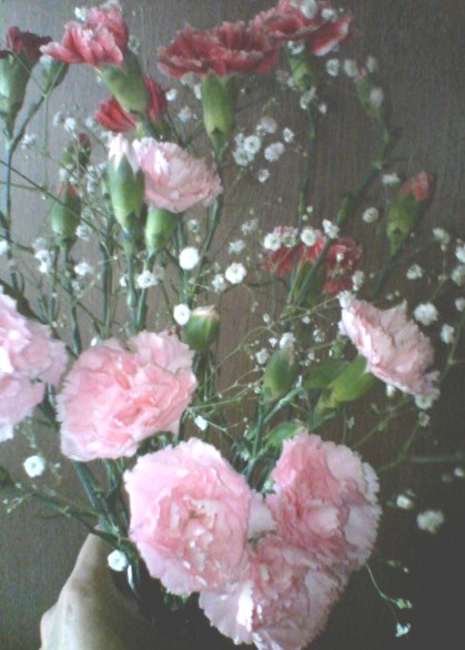 そうそう。子供達からもらったのでした。(爆)我が家の母の日は、母(わたし)だけが仕事でした。(><)(爆)家に帰ったのは午後7時過ぎ。遅かったので食事の準備も出来ず、みんなで焼肉を食べに行きました♪食事を終えて家に帰って来た時、コーヒーを飲もうと思ってやかんでお湯を沸かしていると、後ろから子供達が「おかあさん!」と珍しく2人で呼ぶので振り返ると。。。2人が1つずつ、花束を持って立っていました。「おぉぉ~~~!!ありがとありがと!」と言って受け取ったのは、カーネーション。濃い色の方が娘、淡い色の方は息子からの花束でした。嬉しいって言ったら嬉しいねんけど。照れる方がでかいわーーーーーーーーーーーーー!(爆)今は一緒に水に挿してますけど、学校から帰って来た子供達は、「綺麗やな~~!」と呟いて花を見つめます。あのさ。。。わたしがお花を飾っても見向きもしないくせに。。。。(><)自分たちがわたしの為に準備した!!って言うのに、酔ってるんでしょーーね。(爆)ま、ハードな仕事に追われた母の日も、子供達の就寝前のお花贈呈式のお陰で、無事に終わる事が出来ました♪♪(爆)