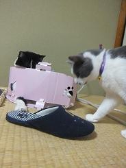 今週はとってもヘタってます今週はお出かけなしですところで「ねこのきもち」も1年くらい購読したらやめようかな~と思ってたんですが、ずるずるとしちゃってます・・・。時々つく付録ですが、うちの子達にはおもちゃが一番いいみたい4月号のハウス型ダンボールおもちゃも、よく猫の遊び心がわかってるな~と思いますすぐに飛びつきました(笑)でも、うちのニャンズには小さくて屋根を取り付けると入れません・・・と言うか壊されました和室にスリッパ持ってこないでくださぁ~いダンボールの穴の開いてる部分て、思わず突っつきたくなりませんか私だけでしょうか・・・・だいだい、手を出す場所が間違ってるちゃんと穴から出してね 壊れるのも時間の問題か(笑)