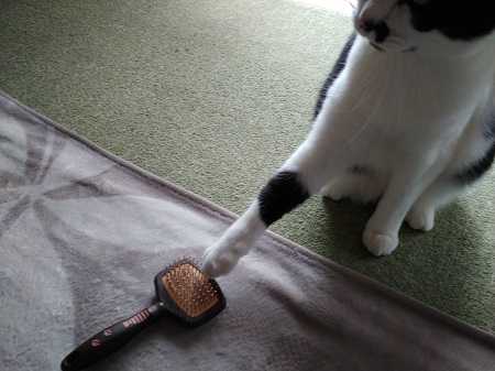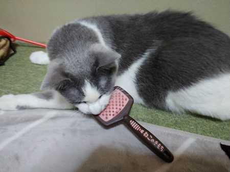 喉はゴロゴロいってるのに、ブラシに嚙みついたり猫パンチしてきます