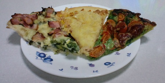スーパーで京野菜の九条葱を見つけて購入したので、夜は葱ピザにしようと決めていました。運良く、ベーコンも安く売ってました子ども達に夕飯は、おうちピザにするからピザ生地を作ってくれる?と聞くと、気持ちよく協力してくれました。もう、何度も作っているので、生地作りは、3号がすごく上達して、生地作りはもちろん、ピザ生地を麺棒で伸ばすのも上手になってきました。他には、3号の好きなツナマヨコーンと、バジルソースが特売になっていたので、バジルソース+モッツアレラチーズ+プチトマト+生ハム(頂き物を使っていなかった)にしました。今日は、2号がいつもよりあんまり食べなかったので、思ったよりも余りました。明日の朝食もピザです。オーブントースターでチンします。今日の出来映えはと言うと、葱ピザのベースに七味を入れるのですが、今日は七味の量が多かったようで、子ども達全員から、食べられない訳じゃないけど辛いと言われてしまいました次回は、辛いと言われないように、気をつけます。1号は、葱ピザが一番好きなのですが、バジルピザの味も気にいったようでした。久々に、ピザ写真(左-葱、中-ツナマヨコーン、右-バジル)アップします