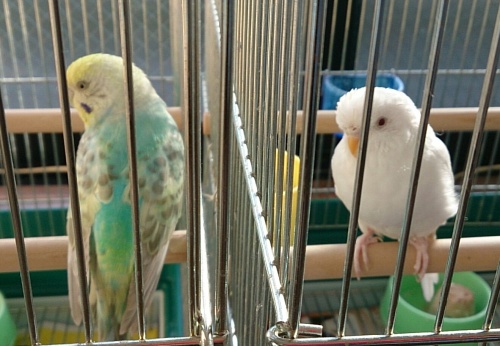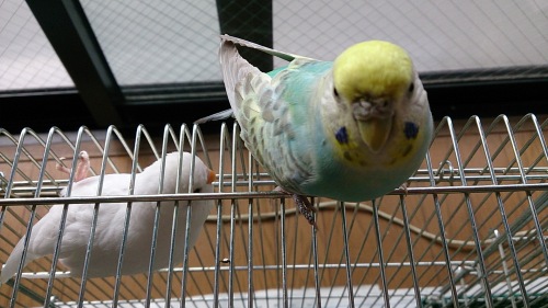 みなさん、こんにちは ちーたんです。ふくが寂しそうだったのでお迎えしてしまいました。クリーム系のルチノーは珍しいからペットショップで一目惚れ生後一か月経っていたのであっという間に巣立ちして今ではプチ籠デビューふくはちょっと戸惑っているみたいで近づこうとしません(^▽^;)ピコは興味津々でふくの事を観察しています。ふくと仲良くしてくれたらいいなぁと思ってます。ふく同様にピコの事もよろしくね。
