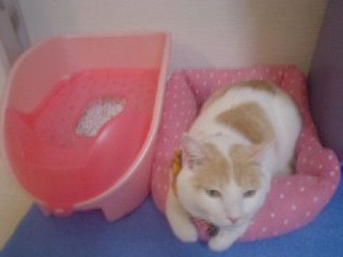 猫用ベッド、買いました。ちょっと狭いニャン。寝床の隣が、トイレなんて。刑務所みたいだニャン。