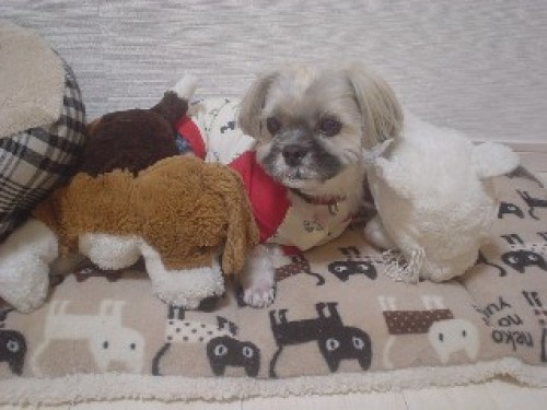 ぬいぐるみに埋もれる、シーズーちゃん。ちょー可愛い。猫さんぬいぐるみを乗せてみた。ちょー怒ったがなー。