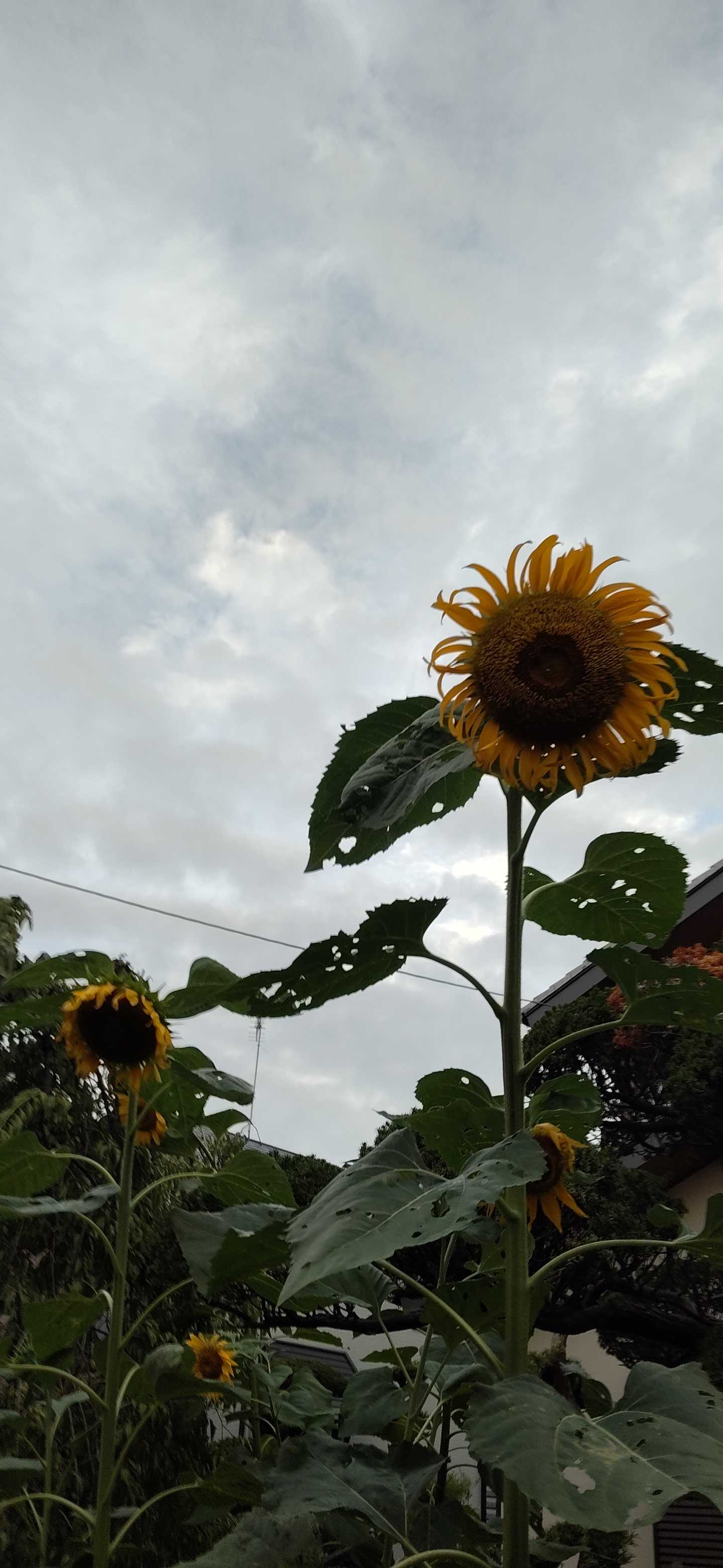 今朝は五時半に散歩に出ました雨降りなど続いたので・・空はどんより曇り空ご近所のひまわりも雨沢山降ったせいかうつむき加減です大きなひまわりは2メートル以上の高さがありますそれに反して千日紅は紫、白と沢山咲いて元気です大通り歩道に出てしばらく歩いていると何か歩道に落ちていますオレンジっぽいいちご?誰か落としたのかなと上を見たら大きな桜の木?に数個同じ実がなっているの発見イチゴの木??何かオレンジっぽい実が見えますサクランボではありませんこんな大木でイチゴの木?桜の木だと思いますが信じれません何の木でしょうか❓昨日3時半ころ孫家族楽しい沖縄旅行終えて無事帰ってきました皆お昼ご飯も食べず帰ってきたので途中お弁当や焼きそばかって来てやっと自宅で遅い昼食食べたそうですお土産は皆疲れ切ってるので後日持っていくと連絡ありました無事に帰ってきてくれただけで安堵しましたよまた旅行の話聞けるの楽しみです