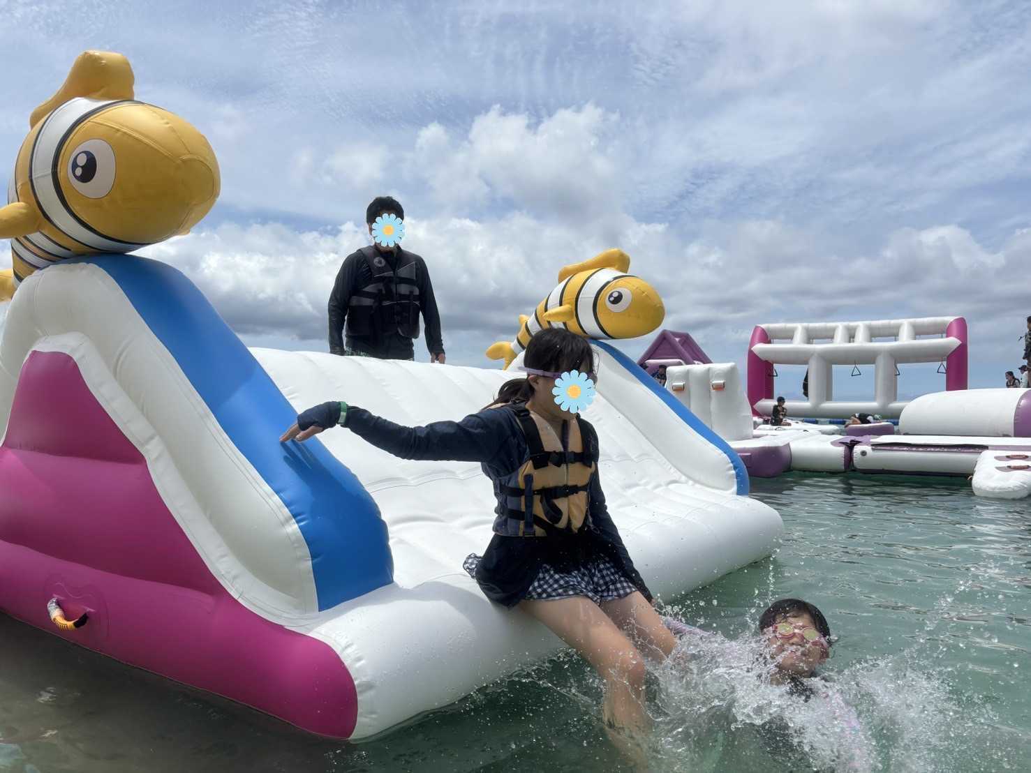 晴天の沖縄最終日は・・親は二の次移動もなるべく遠い所は行かないで子供達の喜びそうな所ばかり探して行ったようでジャングリアが目的の旅なので北の今帰仁中心です4日は好きなチーズハンバーグのランチ赤いハイビスカスの花1輪添えて沖縄らしいねお腹も満たし海に入りお魚とりですママは子供達の監視役!!目が離せませんどうやら何かとれたようです何とシャコのようですね孫たち回転ずし屋さんで見たことあるかもね子供のシャコ??あとは何がとれたかな?親も大変子供優先の旅だから・・息子から夜ライン📞があって日差しが強く真っ黒に日焼けしたそうで顔がヒリヒリ顔中日焼け除けシート一杯貼ってました(笑)5日目は名護市にあるパイナップル園へ入口まで自動カートで行きそれからパイナップルトレインで園内巡りパイナップル畑めぐりそれから恐竜エリアを空中遊歩道歩いて見学もちろん美味しいパイナップルも食べました