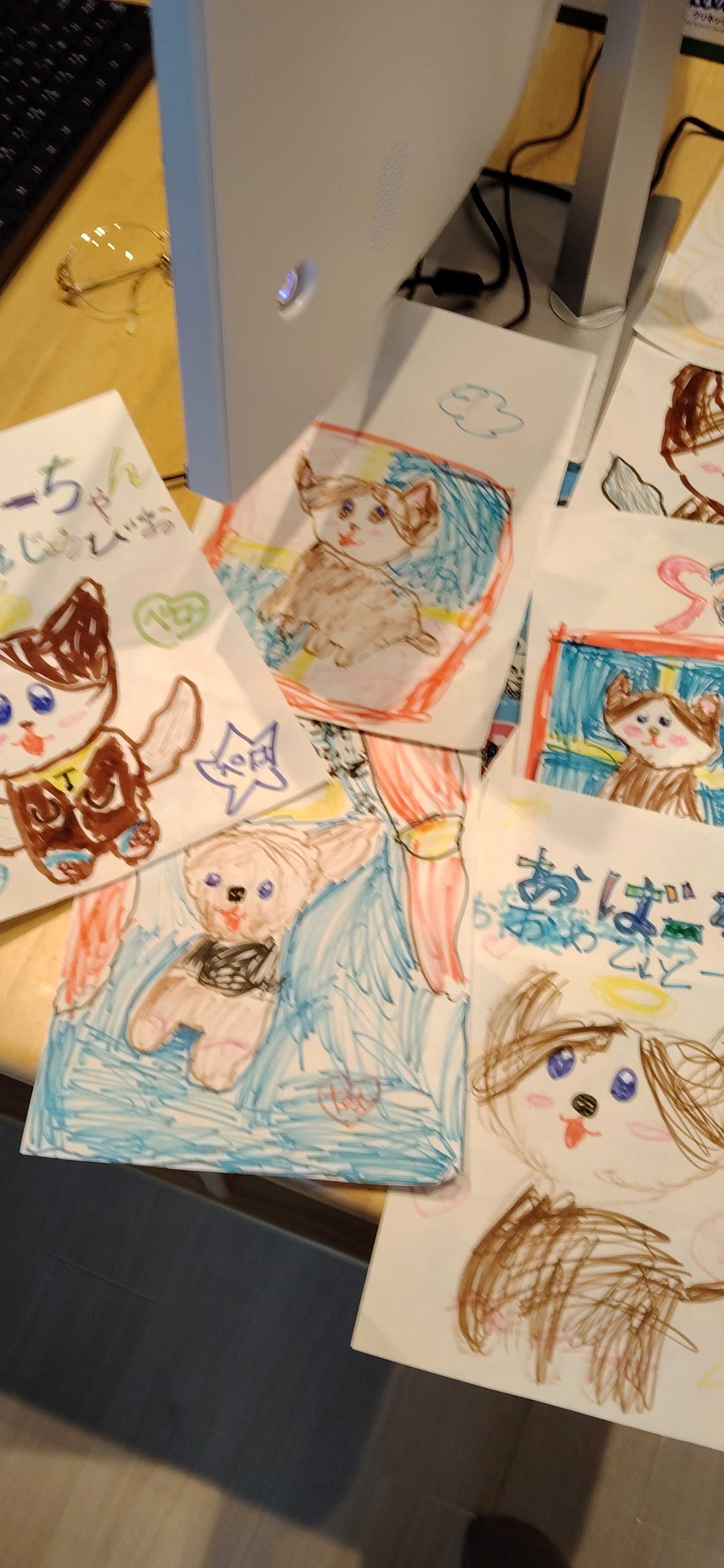 昨日孫たちからもお絵描きのプレゼントもらいました私がチョビちゃん大好きといつも言ってるのではぁちゃんは今は実在しないチョビの絵をかいてチョビからもおめでとうと言ってる絵を沢山描いてくれましたなぁちゃんはタブレットからチョビがお誕生日おめでとうと言ってる絵を描き何度も見せてくれましたそれも演出があって帰るまで3回に分けてくれました子供なりにいろいろ考えているんですね喜びも一回こっきりじゃなく3回喜んでもらおうとね今日は昨日つたやで買った本よんでます「成瀬は天下を取りに行く」を・・近くのひまわりの花160センチはあると思うんだけどやっと花が見えました茎も太いーーー