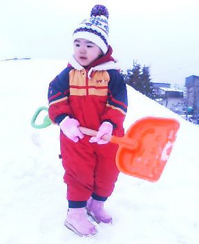 今日は天気も良く、午後からソリ遊びをする子供達の声。。。。いつものごとく外行きたいと言い出した。ママは行きたくないのよ~。と知らん振り。そうはさせない1.2号!!はい。連れて行きますとも。2号は相変わらず立ったままあまり動かない。じっとしていると寒いと思い。さぁ~行くよ~と笑顔を振りまいてもダメ~~。ソリ滑るよ~と言うとコワイ~コワイ~と泣き叫ぶ。う~~ん 雪でどうやって遊ばせるか考えなくっちゃっ。1号は意気揚々と子供達の輪の中へ。同年代よりなぜか年上のお姉ちゃん達が大好き。1号に一緒に遊ぼう~と言われるお姉ちゃん達。快く一緒に遊んでくれた。2号と何とか遊んでいるとソリ遊びをしていた1号が遠くの方でなにやらお姉ちゃんに言いまくっている様子。山の上まで登ってきた1号に[どうしたの?」と聞くと「もうソリやんない。」プラス意味不明のお言葉???下りて行き今度は持参のスコップで穴堀り。1時間後、部屋に帰って1号の帽子を取ると!!!!!!あれれれっっっおでこにたんこぶ擦り傷ができていた!!「この傷、どうしたのーー?」と聞くとお姉ちゃんとソリをしていてコケたらしい。だからソリやめたのか~!理解!!あの時ちゃんと聞いてあげれば良かったなぁ~~痛かっただろうに!!こんなこんな一日でした。あれっ何か目もはれてるね~これは寝すぎ!?かな