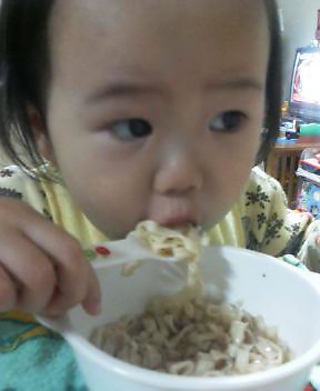 うちの2号くん・・・・・・。只今1歳8ヶ月。もう自我が目覚め、なんでもしたいお年頃~ラーメンを自分で口に運ぶ姿を見て「2号くん成長したね」と微笑むママでした。私が神経質!?なのか食べこぼした物はすぐ取ってあげちゃうし・・・・。そしてすぐ口を拭いてしまいます。それを常日頃見ている1.2号もちょっとこぼしても同じくすぐひろいます。そして二人で口ふきふきしてごちそう様をします。のびのび自由に食べさせたい気もするのですが。何度か自由にさせたら大変な事に!!今はあまりよごさず上手にたべれます。お~っと上手く口に運んでおります「チュル、チュル」こぼさず食べれました~。