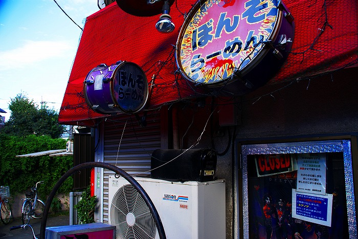 いい天気でしたね。遅い朝、窓の外の青空を眺めながら、ふと世田谷の経堂へ行こうと思った。駅を降り当てずっぽうに歩き始めて数分、ある看板を見つけ僕は大きくのけぞった。危うく手にしていたカメラを落としそうになった。(ちょっとおおげさかな^^;)ご存知の方には説明の必要もないのだろうけれど、この店名は、70年代の伝説的バンド”Led Zeppelin”のドラマーJohn Bonhamの愛称である。それにしても・・・店が臨時休業の為(店主はライブだそうだ)詳しくはわからないが、おそらくラーメン屋・・・なのだろう。(入り口の扉には休業のお詫びに餃子のサービス券が下がっていた。)でもこれで飲み屋っていうオチもあるかもしれない。油断はできないぞ!^^;僕は慌てる必要もないのに、手早くシャッターを切った。余談だが僕は中学の頃、仲間うちでZeppelin担当だった。TUTAYAの無かった時代の僕ら中学生にはLPは高値の華だった。次々現れるロックの新星の音を手に入れる為に僕らはそれぞれ担当を持った。Deep Purple、Van Halen、Queen、Kiss・・・レコードを聴いては勉強そっちのけでギターのリフを誰よりも早くコピーすることに熱を上げていた。。おそらく店主は僕の年齢±2ぐらいだろう。そしておそらく僕と同じような青春時代を過ごしたのではないだろうか。きっとラーメンはそれほどおいしくないだろう。箸はもしかしたらドラムスティックかもしれない。でもそれでいい。ZeppelinをBGMラーメンをすすれる店はここだけなのだから。口直しにおまけです^^;