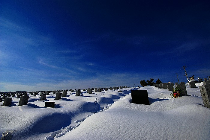 ”この時期お参りされる方は滅多にいらっしゃいませんが・・・”霊苑事務所のおばちゃんは電話の向こうでやさしく諭すようにこう言った。”そうですか。そこまで車で行けることは行けるのですか?””はい、それは大丈夫です。でも、墓石も半分以上雪の下ですけれど・・・””そうですか・・・。とりあえず行くだけ行ってみます”一年前、その霊苑のある丘を訪れたのは4月だった。一面の雪景色からわずか20,30cm顔を出している墓石が並ぶ中、僕はタクシーの運転手さんと雪をかき分け一つの墓石を探した。今日はそれよりも1ヶ月以上早い。僕はホテルを出、酒とお花を買い、たくさんのタクシーの中の1台に乗り込んだ。”ま、まるで3月か4月の陽気ですよ。いつもならこ、この時期路面なんか見えないですからね”人のよさそうな運転手はつっかえながらよそ者の僕に旭川のことを話してくれた。車が山の登り道に入る。山の中腹に旅館があるせいか道路は除雪がされていた。車内に強い日差しが右から左から差し込む。”これ、帰りは山の上からタクシー呼べますかね?””あ、まっ、待っていましょうか。どうせ暇ですからね”僕は30分ぐらいで戻りますと告げ、タクシーを降りた。懐かしい景色。一面の白い世界から顔を出した春の新芽のように墓石が整然と並ぶ。時が止まった世界。僕は一年、またこの世界に近づいたことになるのだろうか。新雪に足を入れると、膝近くまで埋まる。何歩か歩いていくうちに、積雪がどのくらいか分かってくる。そしてそれは去年とほぼ同じぐらいの量であることが分かった。僕は汚れをしらないバージンスノーのなかを乱暴に踏み進んだ。僕は足跡を友人のお墓の前までつけたところで止まった。静寂のなかで白い息を吐く。その横の墓碑には去年はなかった友人の名前が書き加えられていた。僕はカメラをポケットにつっこみ、雪をかき分けた。新雪は簡単に払えたが、墓石近くは氷ついていた。お花を供え、缶チューハイの栓を抜く。”ひさしぶり・・・ちょっと飲もうか・・・”墓石の冷たさは、あの時を思い起こさせた。山を降りて、暗くなるのを待って街へ出る。アイスバーンと化した歩道を背中を丸めながら慎重に歩く。そしてホテルから数分のジンギスカンの店へ入る。若い人で溢れた店内の隅の方で、厚く切られた生ラムを食べる。ご飯の香りがよかった。普通に炊いているだけ、炭を入れるぐらい・・・と店主は話していた。噛みしめる瞬間の香ばしさが素晴らしかった。店を出て夜の街を再び歩き始める。ふと、交差点の湯気に目が止まる。角々に行商のおばちゃんのような人が何かを売っている。近寄ってみると焼き芋だった。リヤカーは無く、じかに機械が置かれている。写真を撮りたくて、1本購入しようとすると”写真が撮りたくて買うんなら売らんよ”こう言われてしまった。なんでもここでの販売は禁止されているけれど、年寄りなのでお目こぼしを受けているということ。だから撮られてそれがどこかで使われるとここにいられなくなるというのだ。氷点下にもなろうというこの寒空の下で何枚も着込みうずくまるようにしているおばあちゃん。80になるというおばあちゃんの、その着込んだ奥からのぞかせる笑顔はとてもやさしく若々しかった。僕は小さめのを1本買い、その場を離れた。明日は雪になるらしい。丘の上の足跡もいずれ消えてしまうだろう。何事もなかったかのように。少し冷え込みが厳しくなってきた。僕は閑散としたネオン街を抜けホテルを目指した。ポケットの焼き芋が温かかった。