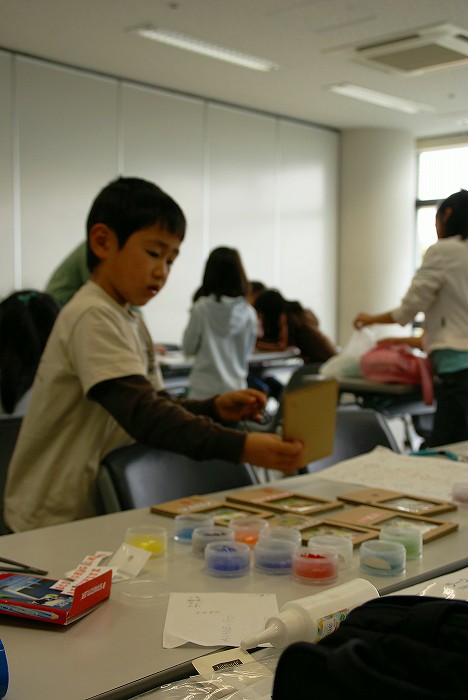 7月に新宿三越のABCクラフトでハンドメイドFESというイベントが行われる。先日、その館内宣伝用ポスターの写真撮影を依頼された。依頼された・・・などと軽く書いているが、自分の写真が仕事になるなんて想像したこともなく・・・まさに夢のような話です(汗)先日の顔合わせでは主催者の方々といろいろお話しさせていただき、皆さんの熱意に触れ、僕も微力ながら協力させていただきたいと強く感じました。とはいえ、ハンドメイドFES(HMF)についてその内容をあまり理解してません^^;ということで、今日はHMFの主催者のでもあるMONPARURE YUKOさんと大野さんの講習会にお邪魔してきました。YUKOさんのビーズ講習には8名の方、大野さんのクリスタルコラージュ講習には14名ぐらいのお子さん達。付き添いのお母さまや取材のFM浦和の方など大勢の中、写真の資料用にいろいろ撮影させていただきました。「すごく楽しかったよ~」昼食休憩に向かう廊下で僕を除けば唯一の男の子が笑顔でこう話していた。楽しそうに話す彼を見ながら、僕は丁度その男の子と同じ年の頃に女の子とリリアンをしていて友達に野次られたのを思い出していた。純朴でただただ幼かった僕は、その出来事で女の子とはあまり仲良くしてはいけないものなのだなぁと心に強く刻んだものだった。リリアンはそれ以来やっていない。もしそれが好きだったら、もしそれが楽しかったら、もしそれをしていると時間を忘れてしまうのなら、とことんやればいいと思う。気の済むまで。飽きるまで。心から楽しんでさえいれば、きっとその周りには自然と輪ができていく。そしてその輪がはっきりと見えるようになった時、周りから多くのものをいただいている自分自身に気がつくだろう。そんな輪をお互い見つけような!ボクっ!