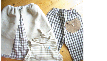 チェックのパンツは娘に。ポケットが手編みでほんとにかわいいんです。