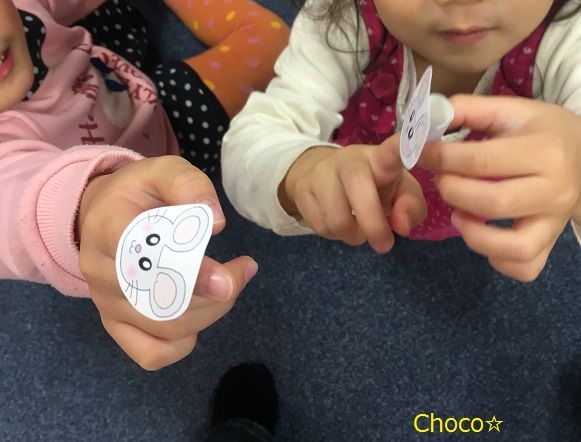習った前置詞を言いながらネズミの指人形を楽しそうに動かしていきます。