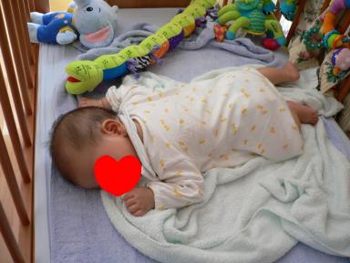 王子がたま~に遊び疲れて寝てしまうことがある。ベビーベッドの中で、タオルくしゃくしゃ、おもちゃ蹴飛ばしまくり・・・しかも気が付くとうつ伏せのままになってるし 今迄あまり写真をUPしてこなかった我が家の王子ですが・・・今日はお昼寝中の写真を撮ってみたので初公開薄毛です最近の彼のお気に入りのスタイルみたいなので、お昼寝中はそっとしてるかな~しかしながら・・・タオルは蹴り倒されて、ものすごいことにいつもなっている。もちろん乳吐きしまくりなので、毎日お洗濯しているおもちゃは・・・彼のお気に入りのものばかりなので、思いのまま遊んでいるが。。。最後は蹴られる運命らしい。ちなみにパンパは鼻と耳をいつもナメナメ。馬は引っ張りまわされ・・・ミツバチは振り回されて・・・ムカデはガリガリされている。一人遊びでご機嫌だったらいいんだけど・・・最後はウワァ~~~ンと泣かれてしまうんだけどねまだもうちょっと一人で・・・というのは無理なのかもね。ちょっとの時間だったらいいみたいだけど。