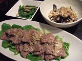 具合が悪いから早く帰る、ステーキとほうれん草のサラダが食べたい、と彼からメール。具合が悪いっていうのに よくステーキなんか食べられるよなーと思いながらも土日に特売で買ったお肉を解凍。お肉が大きいので、飽きないよう2種類の味付けで食べることに。1つは、塩胡椒でシンプルに焼き、ガーリックを乗せるもう1つは、レモンバター風味。やっぱり鶏肉より牛肉の方がウマイな~と言うので、そんなこと言ってたら、我が家は破産します!と宣言。明日からはまた鶏肉生活ですから。。○ステーキ2種○ほうれん草のサラダ○野菜のグリル(ナス・インゲン・ピーマン・トマト・人参○キウイフルーツ、桃
