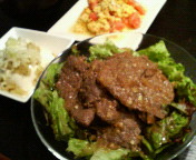北海道産和牛の特売日。昨日の焼肉のことなどすっかり忘れて買い物。暑いし、さっぱりとサラダ風にすることに。タレはすりおろした玉ねぎをたっぷり(丸ごと1個)使って、醤油・にんにく・酢・砂糖・ゴマ油で味付け。あらかじめお肉を漬け込んでおき、焼きながらかける。そしてさらに盛り付けてからかける。これで血液サラサラ~になるかしら。○焼肉サラダ○トマトと卵の炒めもの○冷奴○豆腐とまいたけの味噌汁