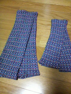 昨夜は息子がなかなか寝なくて、寝付かせるのに時間がかかりました・・・。で、そのまま寝てしまい・・・また夜中に起こされて・・・その勢いで自分もおきてしまいました^^;で、PCしたり手芸したり。何を作ったかというと、レッグウォーマー!その昔買ってあったジャガードのニットを引っ張り出してきました。大人用と子供用~♪早速履いてみたりしてwきちゃないソックスで失礼~。子供用はアームウォーマーにしちゃったりw超簡単♪ただ筒縫いしただけ~。そうそう、先日ちらりと書きましたが可愛いバッグを作りましたよ♪C&Sさんの幅広チノクロスで作りました。中身はこんな感じ。巾着バッグなのでしぼったりできます。私は普通の形のほうが好きだなあ~。バテンレースのバッグがどうしても欲しくて作りました♪もうひとつ違う形で作ってみようと思ってます。