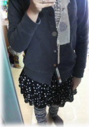 おはようございます~。昨日は近所のおうちで上棟の餅まきがあって、久しぶりにハッスルしてまいりました(笑)家族で拾ったお餅はなんと220個!近所やお友達におすそ分けしました~。楽しかった!けど夜には自分が疲れたのか発熱・・・。流行りのアイツではなかったみたいですが、無理は禁物ですね~。今日は年内最後の仕事なのでもうひとふん張り頑張ります!では昨日のコーデ。(餅拾い前)Go to hollywood・・・フーデッドパーカーユニクロ・・・ヒートテックフェリシモ(haco.のどれか)・・・星柄キュロットNET STAR・・・ジャガードレッグウォーマー付レギンスGTHの405は160サイズです。ちょっと着丈短め&身幅狭めですね~。カラーはブラックです。ネイビーにも見えますが・・・。今日は短めキュロットと合わせましたが、色々挑戦してみようと思いまーす。ボタンが超可愛いです!そして先日マラソンで購入したレギを早速履いてみました♪思ったより高い位置までレッグウォーマーの部分が来るので重ね着にテクがいりそう。短いスカートやパンツだと合わせやすいですね。で、今日のコーデ。デニム&ダンガリー・・・パーカー古着・・・スカートSM2・・・ペチスカートユニクロ・・・ヒートテック今日は朝から調子がいまひとつだったのでコーデを考えられずにいたら、相方さんが「困ったときはパーカー」と言ったのでパーカーで(笑)古着のスカートはすっごい柄が気に入っているのですが、一枚では心もとないのでペチをあわせてみました。****************************最近のミシン。マスクをいっぱい作りました♪上が大人用、左が女の子、右が男の子用です。女の子と大人用はレースが、男の子用はイカリの刺繍がついてます。昨日委託先のお店に初めて納品させていただきました♪みんなお嫁にいけるといいなあ~。最近ハンドメイドがとっても楽しい!今度はオーダーいただいているバッグを作ります~~。