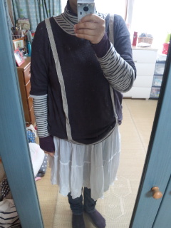 おはようございます♪明日は全国的に寒いんだとか。今日は今から山奥で仕事なので防寒しっかりしていかないとです。雪は日中は大丈夫だと思うんだけど・・・・降らないといいなあ^^;一応ノーマルタイヤなのでちょっと心配。昨日の夜、ウール生地で作ったワンピースをずるして洗濯機で洗って、しかもすぐ干せば大丈夫だったのにうっかり寝てしまって何時間も放置してしまったら見事に縮んでしまいました^^;おばかです。。。で、夜中に悲しくなってもう一着同じものを生地違いで作ってしまいました(笑)それもアホです。縮んでしまったワンピース、肩と着丈が縮んだので産後なら着られそう。産後ダイエット頑張って来年着ることにします(笑)さてさて、先日ポチしたtumuguのサス付きが届いたので着てみました~^^妊婦コーデなのでお腹ぽっこり許してね。インにはユニクロのヒートッテックとSM2のヒートインナーの重ね着♪どちらも薄いので重ね着しやすいし、ヒート系なのでぬくぬく!サス付きはゆったりデザインなのでお腹がぽっこりでも着られて便利~。素材もコットンリネンなので夏でも着られて、これぞ年中着られるアイテムですね!夏はタンクと合わせて着てみたいなあ^^多分これ、臨月まで使うんじゃないかしら。予定日は5月だからこれから大活躍しそうです☆半額で買えたしラッキー!着用カラーはブラウンです♪ぼちぼち春夏物も出てきてますね^^今日は子供服のセレクトさんに寄ってFITHのカタログをもらってきます~。