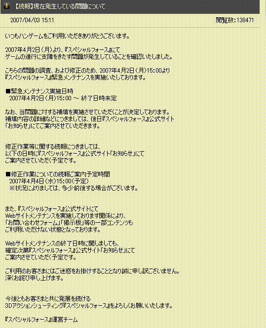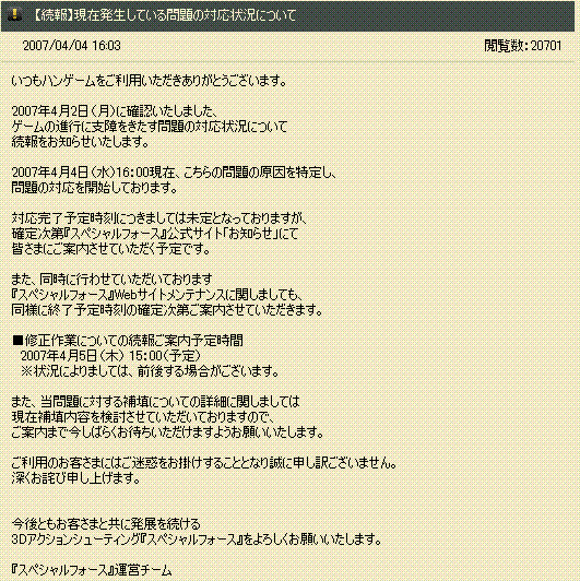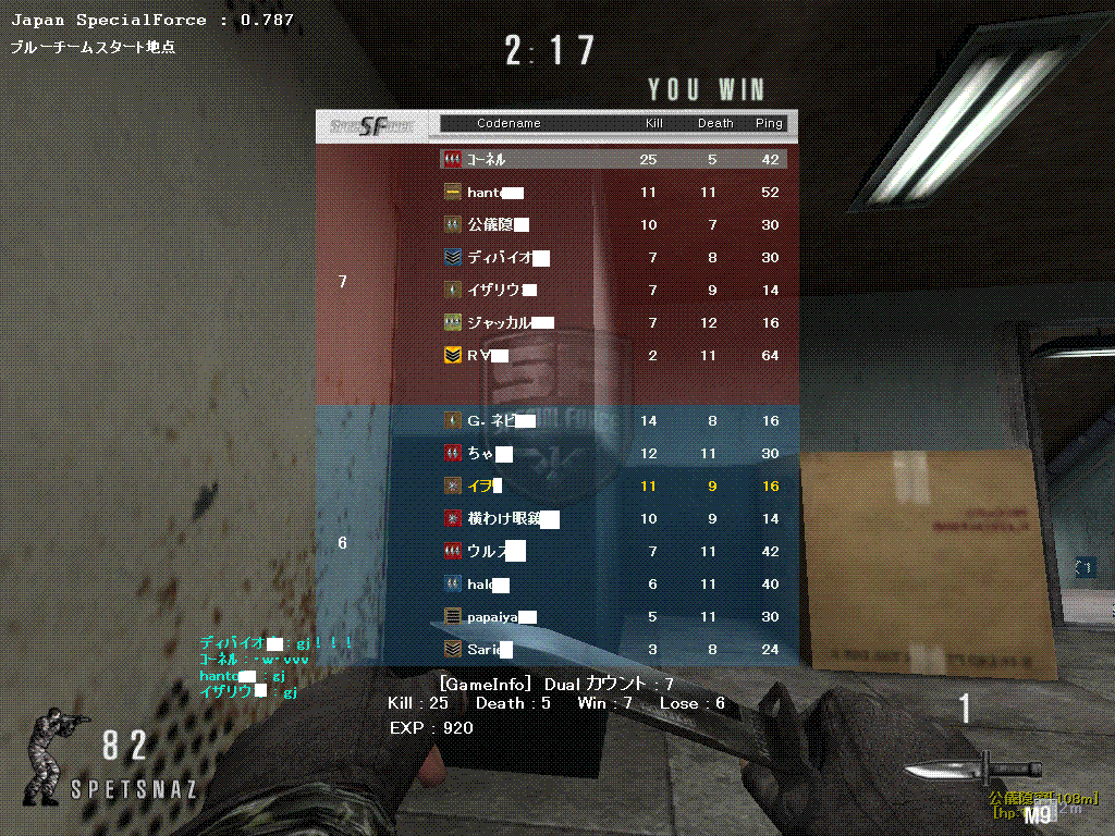 SFメンテ後 臨時メンテ~現在2日目ここまで長いと赤石が、マシな方に見えてくる。終了日時未定ですしね。ここ1週間前、外国にあるスペシャルフォースがバグ・チート使いが多くて閉鎖した、と聞きました。そしてここ1週間 その人達が日本のスペシャルフォースに来て、バグ使いで治安悪化してきてます。外国からのプレイの場合PNG200前後で安定してるので分かりやすいのが特徴ですねアメリカンオンリーと英語の部屋があったのでコッソリ参戦してみました。場所トレイン 10カウント 7人(PNGall200前後)vs6人(日本人3名潜伏)結果10:8で勝利最初から最後まで、箱の中に入っていたり、全チャットが英語で賑やかだったり。少し面白かったデスw---メインIDはFAMAS少佐1ですが特攻してもMGでやられることが多いなぁと思いMG作ってみました。音は低く連射速度も遅いですが結構倒せる。こういうなんちゃってTUEEEが好きですねwwKD1,7で今は安定してます。スナは最近になって面白く感じてきたところで、MGのIDでPSGやってます。1回で5発までなのでリロード切れが最近つらく感じて、別IDでFRFに手出して試してみてるところです----MG in個人戦MGイイヨ。