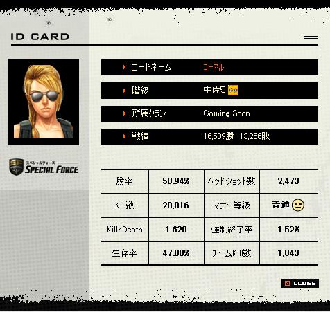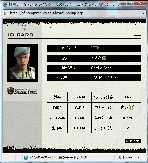 PC変えたら赤石起動初回15秒 2回目以降2秒前後で起動するようになりました!---ハンゲームすぺしゃるふぉーすにてVistaにしてから20秒ぐらいの謎のフリーズがよく発生するようになりました・・カナ入力に変換しますか?(確認メッセージ)がスペシャルフォースプレイ中出るとスペシャルフォースは1回デスクトップに戻るとゲーム画面が真っ黒になっちゃうんですよね><そういうのや、フリーズ→画面切り替えが行われると真っ黒になってry1~2割落ちますv(ゝw・どうにかなりませんk(ryPC変えてからラグなしになったから快適なんだけども・w・----ドーン!!相手に少佐2人もいるのにコーネル君がんばっちゃいました>w<(味方がサブTUEEいなk(ry最後やられると負け確定なのでいつも通り先陣きってFAMAS特攻>ω<これが一番今日でハラハラドキドキしました・w・それでIDCARD↓ 無課金大尉5になりました! IDCARDだとミッション成功回数ないですね・・今のコーネルで210ちょいです!地味に増やそうとがんばってます・w・SFやってる人いたら今度あそびませんか・w・?それではおやすみなさいd・w・b