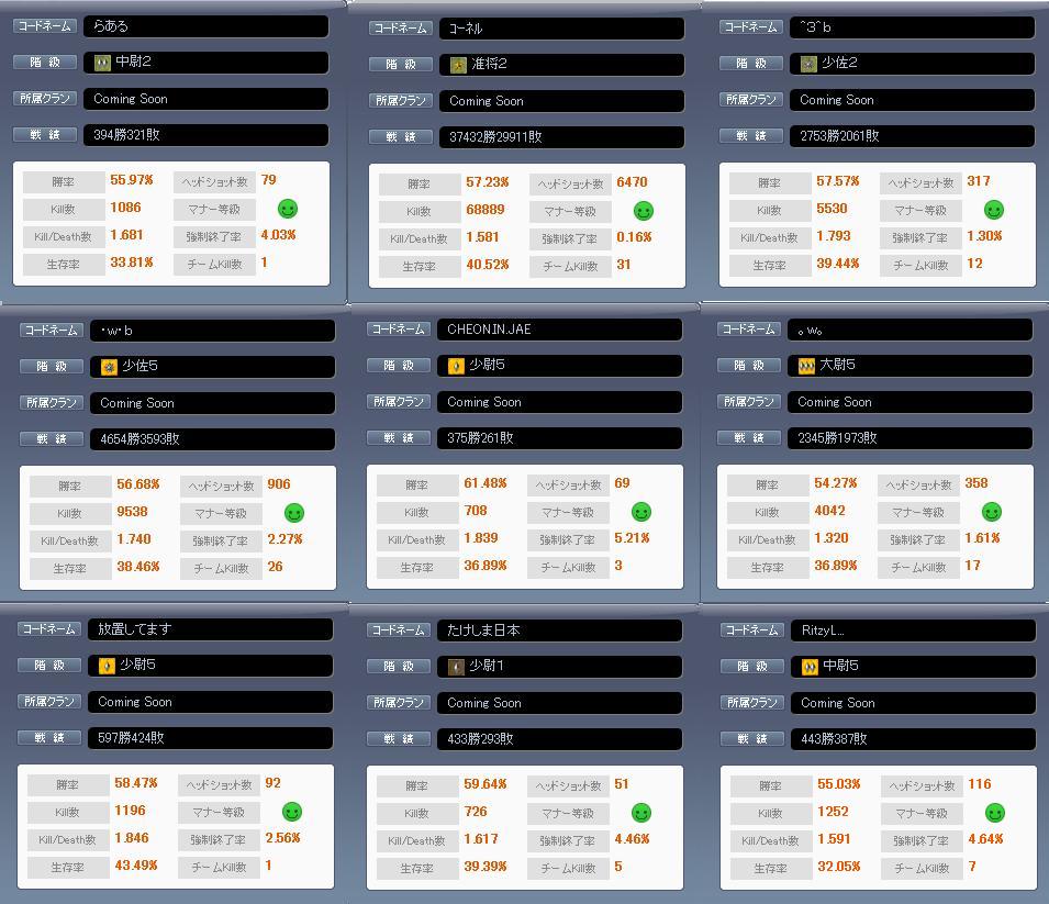 デスクトップPCが1週間経って戻ってきました。ハードディスク入れ替えで、バックアップとらない派だったのでデータ全部あぼんしました。ちょこちょこやってるスペフォー、長期的にやってない時期もありましたがそれなりに楽しめてます。ダイヤ以上となるのは4IDでしょうか。^3^b=MGメイン+PSG・w・b=PSGメイン+M4コーネル=FAMASメイン+PSG。w。=FRFメインずっと無課金でやっていってるのでランキングには載れません…(´・ω|1つのIDで育ててみたかったなと、やや後悔。まぁSP足りなくて武器買えませんが(ノ∀`)---新垢で途中退室なし+「萎え落ちしない部屋」でPSGやってみたら軍曹2で2,5k/dいけたり。キャニオンで3連続連射で近距離の敵ぬっころせたりすぐ死んだり。自分の時代が来てる時は楽しいですね・w・bbbb立ち位置次第で、KD前後するので工夫すればイけます・x・でも仲間がへぼいと1kdトカデスナ。--KD厨ここまで--わいわいチャットできるクラン入ったり、話をするメンバ増えればもっと楽しめるかなぁ。小規模クラン入ってみたら味方弱すぎて萎えたりしたけど。。メモリ2GB インテルcore2duo Vista GeForce7900GSグラボPCでどこでもMAPいけます 入れてくれるクランぼしゅー。してるかもしれない今日この頃そんな近況。