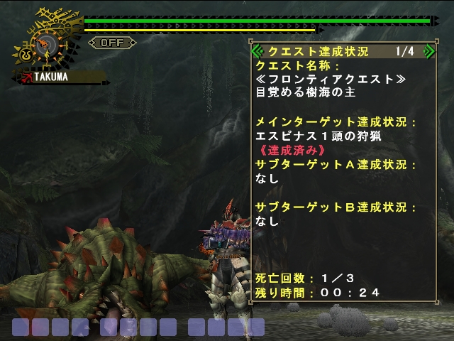 こんにちは、今日目を覚ましたら一時半で休みを無駄にしたタクマですいや・・ありえね・・・一時半ってお前・・・orzいくらなんでも寝すぎだろ自分いや・・まぁ昨日かなり燃えてたからわかるけどとりあえず昨日は久しぶりに燃えたMHF新飛龍!エスピナスの登場だ!っつぅわけで、ネタバレが含まれております見たくない人は「ぶるぁぁぁぁ!」といいながらページを閉じてくd(ryはい、本題入りますとりあえず最初は下見ということで適当にアイテムを持っていき挑戦武器 覇弓スキル 攻撃UP大 見切り3 火事場2 高級耳栓ランナーアイテム 回復・G10個 秘薬2 ペイント40 こんがりG3 攻護符爪 モドリ玉まぁ最初から倒す気満々なんですけどね(ぉなお今回は火事場は封印どんな攻撃が飛び出してくるかわかったもんじゃないですから==;さてレッツエスピナス!樹海に入り探索発見・・・・・・え・・・とSS撮りわすれたから説明だけですが・・・寝てるう~む大剣なら目覚めの溜め斬りで起こすんですが弓なので弱点と思われる頭を攻撃・・・・・・・・・・・・起きないえ?ちょおまwバグかこれwww翼やら尻尾やらに攻撃しても起きないので頭をひたすら攻撃したら目覚めてくれましたが・・・・目を覚ましこっちにも気づいてるのに攻撃してこねぇ(;´Д`)なんてまぁ・・・ねぼけてんのか?攻撃してくださいっていってるようなものですよこれ・・あ~これバグか?メンテナンスあるんだろうな~とか思いながら攻撃してたら怒り状態に怒った途端動急にこっちに向きやる気満々にどうやらエスピナスは怒り=戦闘体勢らしいんじゃとりあえず行動パターンから1・突進おなじみの突進なんですがターゲットに向くなりすぐ突進してきます。レイアなどの突進するぜ!見たいなあれがありません。向く=突進で頭に攻撃しにくい・・・。ためしに正面から攻撃をもらったら毒になりました。しかも毒長い・・・。攻撃範囲は多分翼までだと思う・・翼に当たった場合毒にはならないようです・・・・あとティガレックスと同様突進中ターンしてきます。最高二回・・・だと思う2・尻尾定番のグルグル回るやつ近場にいないからそんなに目にすることがなかったんで回る方向の固定の有無はわからんかったです・・・・当たっていないので毒もあるかもわかりませんでした==;3・ブレスパターンは三種類一・ごくごく普通のブレス。一直線に撃ってくるやつ二・三連ブレス。レイアやガルルガとは違い立ち上がって撃ってきます。攻撃範囲はそんなに広くない三・三連バックブレス。三連ブレスの最後がバックブレスになってます。レウスのあれですね。接近にしては恐ろしい攻撃だと思う・・==;んで試しにブレスに当たってみたところ毒+麻痺というありえん攻撃を受けました==;運よく死ななかったものの即死パターンであることは間違いないです==;4・バックまぁただたんに飛んで後ろに下がるだけ。レイアとかと一緒5・怒りどうもエスピナスは怒りが解けると攻撃してこなくなります。ただしダメージが重なっていくごとに怒る早さもどんどん加速していきます。ディアと同じ==;んまぁ・・・こんなもんですかね・・・まだ色々あるんですが攻撃でもなんでもないから書くのがめんどくさい(コラパターンがわかったところで攻略戦基本は頭を狙いますが、突進時は頭狙ってたら攻撃が当たるので一直線ブレス時に頭攻撃突進だった場合はすれ違いざまに攻撃立ち上がってブレスしてくるときは胸を攻撃どうも聞いた話では斬撃だと頭は固く胸(腹)がやわいらしいですんじゃ胸が弱点?疑問を感じつつも頭をメインに攻撃開始15分ごろ一死、死因は壁際での戦闘・・・・学習能力ないな自分(泣20分ごろ弱り逃げた場所には雷光虫・イーオス・カンタロス・ランゴスタマジでありえないからお前らエピスが寝ている間に掃除掃除・・・掃除が終わり戦闘、30分ごろ討伐に成功bあれだ・・ティガレックスの亜種系だったら萎えてたんですがなかなか面白かったです次は接近でやってみたいですが・・・急突進がなぁ・・・orzまぁではこの辺で・・・・スマブラやりてぇぇぇーーーー!(ぁ