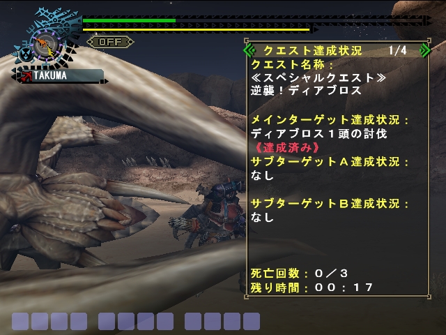 こんにちは、今さらですが裸祭に行ってきたタクマですもう八日前のことなんですけどね(ぉいや~何度見てもすごいですね裸祭褌褌褌褌・・・姿の漢達がいるわいるわ・・・・漢達の渦の中には褌達が・・・(?人が多すぎて写真を撮れませんでした・・・・ぶれまくってるのはありますが・・・・なにこれ?って感じなので載せないことにします・・・さて・・・本題MHFから登場した「逆襲」という名がつくクエストがありますそのなかからまだやっていないやつに二つほど挑戦してきましたまず逆襲のディアブロス闘技場でのタイマンです砂漠じゃないので時間を気にせずできる点で挑戦べ、別に砂漠でもやってよかったけどテーマは逆襲クエだからね!砂漠がめんどくさいってことじゃないんだからね!(ぉまぁあれです・・高級耳栓ランナー・火事場がそろってしまうMHFドスと比べ難易度が大幅にダウンしてしまいます==;だって高級耳栓と火事場がついたら即死コンボとか当たるわけがないですし・・・==;なので火事場抜きで戦いました途中めんどくさくなってきて火事場発動させたけどな(コラ意思が弱いんです・・・貯金箱をすぐ壊してしまうほどに(ぉこのタイムだとディア二頭とか無理だろうなぁ・・・精進しないと・・orz次の逆襲はレウス二頭・・・・闘技場で・・・かなりマゾイクエストを覚悟していたんですが隅っこで戦っていれば一頭ずつ倒せるようで・・そのかわりワールドツアー(ニコニコ・MHでむかつくこと参照・あってなかったらすまん)が多いです時間が減らされるのが我慢できなくなってきたので火事場発動させるためレウスの一撃をもらいました一撃(;´Д`)防御260ちょいで一撃だと・・・orz完全に勘が鈍ってますorzもうあれだ思い出したらムカっときたので結果だけ・・・(コラ火事場を発動させボコボコに・・・・・・ひぐらし途中やめしてるのに何をやっているんだおれは・・・(ぁ暇潰し編だっけ?あれの途中で完璧に進むのやめてる・・・てなわけでひぐらししてきます・・・この辺で・・・・MHFやっていない間にタイムアタックがあったらしい・・参加したかったorz