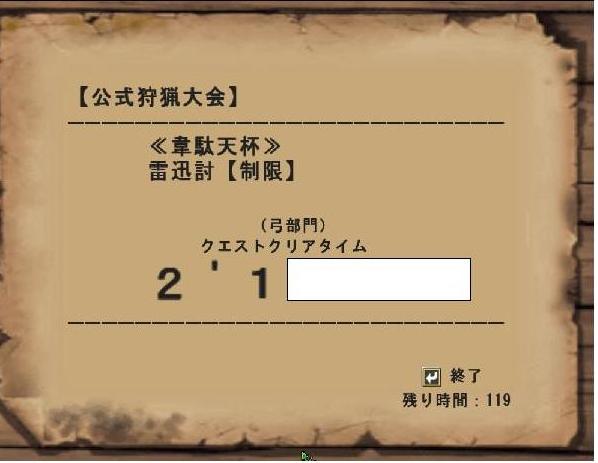 こんにちは、日記のネタが豊富すぎてどれを書けばいいかわからないタクマです今日韋駄天の話になる予定だったんですが予想外のイベントが二回も起こってしまったのでラージャン・紳士との遭遇・韋駄天の三つなわけですとりあえず全部ザーっと流す程度に・・・・今日韋駄天が始まっていると思って早速やろうとしたんですが開始は18時からだったらしくまだ始まっていなかったんですよ(17時にINまぁ・・あまった時間があるなら昨日のトラウマを解消しよと思ってラージャン二頭へ昨日眠らすということを学習したのでパクらせてもらいました(ォィしかし眠らして倒すのはいいんですが・・・壁際きつすぎる(;´Д`)レーザービームをもう一頭に当てないように誘導しないといけないし壁に追い詰められすぎてもいけないし・・む、難しいぞこれ・・・制限されるラージャン戦なんてソロじゃやったことがなかったので難しい難しい==;火事場なんて使ってる場合じゃなかったので普通でやってたんですがあっという間に二死ですよ、アハハマジ許せんこのクエその後すごいチキンモードで何とか一頭は倒せたんですが既に30分経ってましただが・・・あれだ・・一頭倒せたならもちろんアレを発動させる!大タル爆弾発動!火事場力+2!こいつは自分に一定のダメージを与えることにより攻撃力を1.5倍にするスキルだ!(うる覚えそして強撃ビンをつけることによってさらに攻撃力を上げる!いくぜ!この猿野郎!脳内ではこんなことやってましたがすごくチキンな戦い方してました(ォィビンは一頭目で全部使ってたんですけどね・・・ほんと妄想んでトラウマ解消眠らせないとかなり無理のあるクエストでした・・・それで休憩を挟み18時になったのでキリンへもちろんやるのは制限あり装備的に制限無しだと上位には入れないと思ったからですかなりいいわけですどねでもほんと無理なきがするんですよ本当に・・・(´・ω・`)制限ありなのでレア度2以下の弓・・・かつてお世話になったハンターボウの出番ですキリンで基本のおさらいってことですかね時間的にハンターボウなら10分きればいいほうかなぁ~という気持ちでクエストを始めたんですがなぁにこれ~?10分きる前に3分の壁を越えたようです・・・支給品に眠り投げナイフと爆弾があったからできる技ですが・・爆弾つよいな(´・ω・`)クエ中にメールが来ていたので誰かな~と思ったら部長さんだったメールを読んだら部長さん「変態メ!」ちょwwサーセンwwwいきなりすぎて吹いた、本当にありがとうございましたってか・・・なぜいきなり変態扱い・・・マテマテキョウハマダナニモヤッテナイハズそんなこんなでクエストに行くことになって何する~?みたいになって部長s「じゃあ逆ラーやろう、火事場でね」じゃあ逆ラーやろう、火事場でねじゃあ逆ラーやろう、火事場でねじゃあ逆ラーやろう、火事場でね・・・イ゛エ゛エェェェアアアアアアアアアアア!!!!いや・・やりたくないわけじゃんかったんですよでも昨日のトラウマが酷かったので・・・うぐ・・・結果問答無用につれてかれて二死しました・・・二人だけだったからそんなに落ちて込んではないんですけどね(´・ω・`)次に自分の希望でイベクエのレウスに赤レウスはちゃちゃっと終わらして蒼に行くわけなんですがあまりにも赤レウスが早く終わってしまった・・どこが・・どこが中途半端な弓師ですか・・思いっきり腹攻撃して怯ませてるじゃないですか(*´ω`)そんなこと言ってたら「ほめてる?w」ツンデレ風に返してあげると部長さんは「萌えた・・・」この変態メ!ごめん言い返したかっただけ、後悔はしていない順調に蒼も倒してたんですが途中で自分が毒キックを食らい昇天まぁ・・ここまではよかったんだよ・・ネタ提供ありとか言われたらね・・・なにか言い訳しないと面白くないだろ?(間違ってますってかネタ提供ありとか言われたら黙っていられるかーー!ってわけで言い訳をしていたらカブラスに殺されて二死いや~・・・思考が完全に停止した・゚・(ノД`)・゚・。なんだよこれ・・・誰かと遊んだら必ずといっていいほどチャト死してるじゃないかうん・・いい死に方すぎる・・部長さんにこんな死に方してもらいt(銃声クエが終了後ご飯とのことだったので解散その後休憩を挟みながらキリンキリンキリン最高のタイムで二分三十秒をぎり切るタイムがでました今日はこの辺にしてまた明日挑戦したいと思いますではこの辺で・・・日記書いてたら日付変わってるやん・・orz