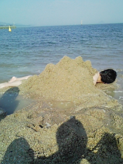 こんにちは、三連休で実家に帰っていたタクマですもう夏を満喫しました・・・私の夏は終わりました・・それほどハイになって遊び尽くしました・・・さぁ・・・明日からまた仕事ふんどし締めていかないと(キリちょっと少しほど休みの間のお話を・・・こんなに休みがあるんだから遊ぼうぜ!的なノリで友達と遊んできました何も計画無しに遊びに行ったのでグダグダなドライブを楽しんできました目的あったにはあったんですが出発して一時間で終わってしまったのでどうするどうするといって僕達は海に来ていた・・なぜだろうか・・なぜか海があったんだ人が少なく絶好の海日和に・・・・いくしかねぇだろう!漢四人で海に行って来ましたよむさいとか思った君はそのとうりだけど心の奥底にその思いをしまって置いてください(?流れ的に当初の目的終了→ブラブラ→買い食い買い食い→あ、あそこ海あるじゃん!→水着購入→海にイヤッホイ泳ぐの面白すぎるね、いい年してはしゃぎすぎでした途中アホな提案を出したら乗ってキタA君はしゃぎすぎだよ・・・だがそれがいい周りのすごく哀れみの満ちた視線が痛かったが気にせず埋めました(コラみんなでバサルモス!バサルモス!と言いながら楽しそうに埋めました次にじゃんけんして誰を埋めるか決めたら自分に決定いや・・いいんだけどさ楽しんだけどさあきらかにさ・・・一点に盛りすぎ(;´Д`)!何これ写真撮ってもらって初めて気づいたよこれやたら尻と腰の辺りが重いと思ったらこれかよ(;´Д`)うつ伏せじゃなかったら反り返ってるt(自重しますしかも動けないからクソ恥ずかしいでるのにすごく時間がかかりその間にも写真撮られてて「亀の出産!亀の出産!」といい爆笑していた友人その後腹いせに海の中で・・・・・みなまで言うまい・・==;疲れたころにカキ氷を食べて帰宅しました^^いやぁ・・海最高bというか地元の友達と遊べただけで最高・・・ホームシック再びorzもう・・今日はこの辺で寝ます==;では・・・25日から韋駄天がまた始まりますね、キリンらしいですけど・・ちょと今回がんばりたいせめて100位以内に入りたい・・・前回のレイア入れたけど上位に入れなかったのでリベンジもかねて