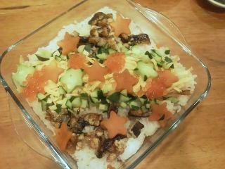 今日は七夕なのですが、雨ですね。。。気分だけでもと思いちらし寿司を作りました。 一応卵は天の川を意識して(笑)ちょうどいただいたうなぎといくらがあったのでなかなか豪華な仕上がりになりました♪他にはジャガイモの煮物、小松菜・えのきのお浸し、味噌汁が今日のお夕飯のメニューでした。娘たちが「今日は雨だからおりひめとひこぼし会えないのかなぁ~、可哀そう」というので「雨雲で見えないだけで雲の上で会ってると思うよ。」と答えてあげました 次女アイネが園で作った短冊。[リボンが欲しい]と[プリキュアになりたい]って書いています。プリキュアはまぁいいとして(ーー;)リボンが欲しいって・・・・・・・すぐに叶いそうな願いなんですけど。。。 そして長女サアヤが絵を描いてました。うまいかどうかは??別としてイメージつかめてますよね?真ん中のハートが可愛いそのさあや、なんと今年の運動会の学年代表リレー選手に選ばれました!!上位5位までが代表リレーの選手なのですが5位の子は補欠なんです。去年は5位で補欠だったサアヤ。練習には参加するのですが本番では誰も欠場しなかったため結局走れませんでした(><)それが悔しかったのか、今年は絶対選手になる!と張り切ってました。しかも1位だったようです我が子ながらスゴイと思いました。
