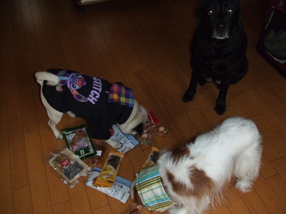 先日のちゅらの誕生日のプレゼントアレルギーを持つエルモも安心。。『お菓子セット』そして主役のちゅらには『ジャンボプー』お菓子を全部ばら撒いて自分達で選ばせて見たとっても遠慮がちなちゅら。。。とりあえず。。小さなクッキーの袋を持ってハウスへ^^そしてジャンボプーさんをみて。。やっぱり遠慮してる><ちゅらさんがジャンボプーさんをいじめてみた^^そしたらいつものように遊びました♪これからも3ワン揃って楽しい誕生日が迎えられますようにちゅら!7歳のお誕生日おめでとう♪^0^