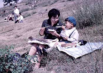 ・昭和43年(1968年)の初夏に、出身大学の TM教授 から知らせがありました。 「君の行き先について、話をしているが、秋までには決まると思う」私はどこへ赴任することになるのか、あえて聞きませんでした。 「よろしくお願いします」 とだけ返事をしました。そのころ、勤めている KF大学 でも、大学紛争 が始まっていて、教授会側と学生自治会とが 団体交渉 を続けていました。それまで下の者の意見を聞いたことがなかった教授たちが、急に我々を集めて、教授会側に同調するようにと働きかけました。私は、この大学にいるのもあとしばらくと思って、紛争にかかわる会議などには、欠席するようにしました。そして、京都での最後の夏を楽しもうと、この年(1968年)の8月に、京都府久美浜町(現・京丹後市) へ 海水浴 に行きました。長男がかなり歩けるようになってから、あちこち連れて行きましたが、この年、幼稚園に入ったので、海で楽しませようと思ったのです。 奈良公園若草山でのお昼久美浜(くみはま)町 は京都府の西北端にある町で、深く入りこんだ 久美浜湾 の入口をふさぐように、砂洲が西へ伸びています。ここを 湊小天橋(みなとしょうてんきょう) と呼んで、その外側が、日本海に面した遠浅の広い浜になっています。 湊小天橋 浜で海藻やハマグリを拾う妻と長男 浜で海藻やハマグリを拾う妻と長男 続昔から 「子は宝」 「子は鎹(かすがい)」 「子は三界の首枷(くびかせ)」 などと、さまざまに言いますが、今から振り返ると、子供というものは、幼稚園児のころが、親も子も一番楽しい時ではないか、と思います。 * * * * * * * * * * * * * * * * * * * * * * * * * * * * * *この年は、秋になって大学内の紛争がいっそうエスカレートし、落ち着かない日が続きました。年が明けて、昭和44年(1969年)1月、TM教授 のところへ行き、私の赴任先が 香川大学 にほぼ決まった、と聞かされました。香川大学 と聞いて、私は驚きました。香川大学農学部 へは2年余り前に行ったばかり。そのときの W博士(2011年11月28日のブログ参照) が停年退官になる、その後任ということでした。3月初めに転職が確定して、京都市 を離れ 香川県 に移ることになりました。私にとっては、公私ともに、新規まき直しの年度替りでした。