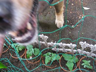 庭から2階のベランダまでネットを張り、地面に朝顔を植えました。朝顔は下から順に枯れていきますので、グリーンカーテンにはならないでしょうけれど、今年は朝顔でやってみます。写真を撮ろうとしたら・・・・・ 茶ノ助!何やってるの! あぁ~! チョット待って! だから・・・暴れないで! やっと、取れた! 魚も鳥も網にかかると暴れますが、犬も同じなんですね。大暴れ!朝顔の写真を撮ろうと思ったのですが、犬猟になってしまいました。努力の朝顔が少し写っていますが、咲いたらもう一度撮影してみます。