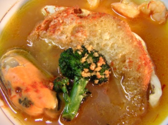 ブイヤベースは、南仏プロヴァンスの郷土料理だ。地元の本来の作り方は、市場で売られているポアソン・ア・スープという白身の雑魚を出しにしてちょっとどろどろするくらいのスープ・ド・ポアソン魚味トマトサフラン風味のスープを作り、そのスープで魚や海老貝類などを入れて火を通して食す料理だ。 サンク・オ・ピエ5周年記念コースの一品。 サンク・オ・ピエホームページ