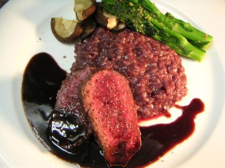 鹿の背肉のローストにボルドーの赤ワインで炊いたリゾットを添えてある。ソースは赤ワインベースのポワヴラード・ソース(胡椒風味のソース)。 シャトー・モンローズの87年にあわせてみた料理がこれ。モンローズはボルドーのグランヴァンの中でももっとも長熟なワインのひとつ。87年はリリース当時の評価は低かったのだが、10年程してから見直されてきたヴィンテージ。開けてみるとまだ若いくらいで、果実味もたっぷり残しながらも古酒の複雑な風味も出始めていて、サンテステフ特有の土の香り、、、雨上がりの森のような湿った土と腐葉土の香り。干したプラムやチェリーのニュアンス、さらにエスプレッソコーヒーやクローブやアニスなどのスパイス系の香りもちらほら、、、。 ボルドーワインにボルドーワインで炊いたリゾットを添えて、赤ワインベースのソースを合わせればこれはもう間違いのない組み合わせと言えるだろう。