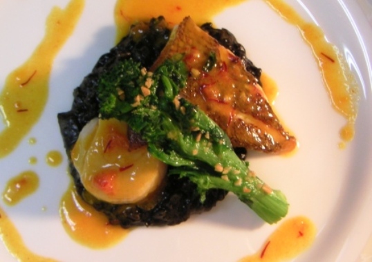 今年に入ってから魚料理はこればかりやっている。 もちろんリゾットはイタリア料理だが、最近はフランスの三ツ星シェフたちも積極的にイタリア風の“アルデンテ”のリゾットを取り入れているようだ。 私のリゾットのやり方は、ベニスのハリースバー(ヘミングウェイが常連だった有名店)のリゾットの作り方を周到したもの。詳しい作り方は過去ログにあるので探してみてください。 鯛とホタテをソテーして、イカ墨のリゾットを添えてトマトとサフランのソースを使ってある。青味は菜の花。春も近い。
