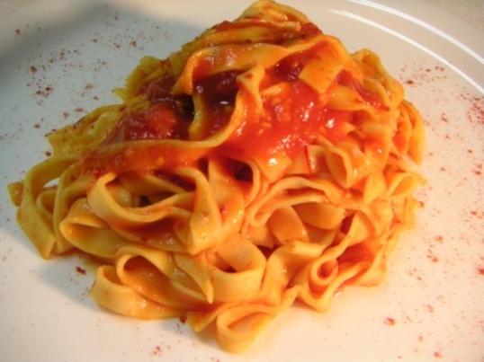 私の裏技のひとつ、手打ちパスタ。これはシンプルにサフラン風味のトマトソースだけで和えてある。普通イタリア風の手打ちパスタの配合は、薄力粉100gに卵がひとつとオリーヴオイルと塩を少々というのが普通だろう、、、。私のレシピはかなり極端で、強力粉120gに卵ひとつとオリーヴオイルと塩少々である。実際に作ってみると生地がなかなかまとまらないほど固くて水分が少ないので、捏ね上げるのに苦労するが、コシがあって美味しい生地を求めて色々やっているうちにこういう配合になったもの。今月のお勧めコースの一品