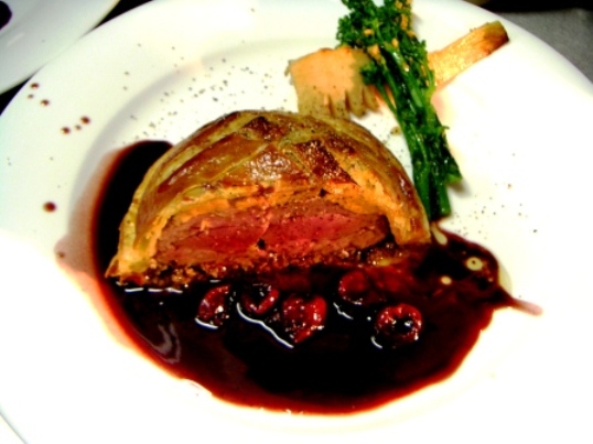 これはお客様のリクエストで作った“鳩のパイ包み焼き、チェリー風味の赤ワインソース”合わせたワインは、モレ・サン・ドニの1級畑2003年。ワインの果実味に合わせてほんのり甘酸っぱい赤ワインとチェリーのソース。パイの中身は、中心に鳩の胸肉、周りをはとのモモや手羽先肉と豚のミンチを混ぜたもの、一番下にはキノコのデュクセル、一番上にはフォアグラが少し。きれいなロゼに焼けて肉汁がたっぷりに仕上がった。筍と菜の花を添えて、春らしく、、。