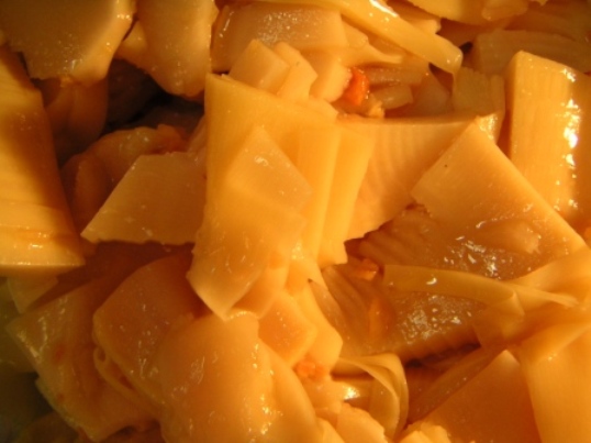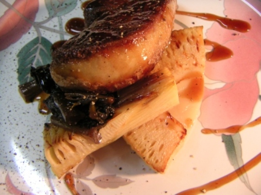 筍は糠でゆでてから皮をむきブイヨンで炊き上げる。汁を切って澄ましバターで焼いたものにフォアグラのソテーを添える。ソースは蜂蜜とバルサミコに醤油を少し加えて塩で味を調えてコーンスターチで軽くとろみをつけたもの。黒胡椒と山椒を振って、、、アルザスのゲヴェルツトラミネール、それもヴァンダンジュタルティーヴに合わせてみたいもの。このときは、山椒は使わずにロワールのヴーヴレイにあわせた。タケノコ情報