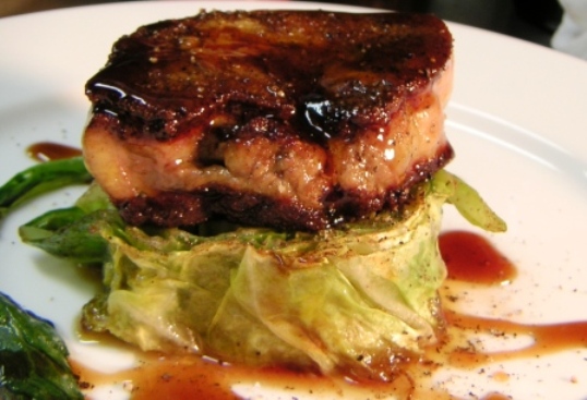 フォアグラは甘みのあるものと相性がよい。フルーツならリンゴ、サクランボ、柿、アンズやプラム、洋梨、桃、、etc、野菜なら焼いた玉葱、コクのあるマッシュポテト、柔らかく煮た大根、それから飛びきり相性がよいのはキャベツ!糖度のある春のキャベツを澄ましバターで焼いて焦げ目をつけて焼き、カラメルの風味をつける。こんがり焼いたフォアグラとあわせる。ソースは蜂蜜とバルサミコをベースにした甘酸っぱいもの。