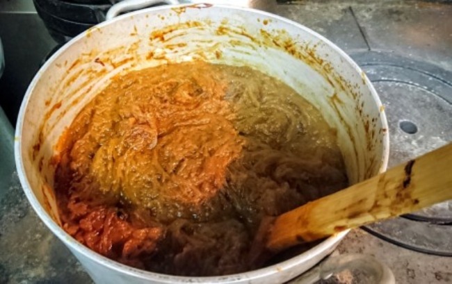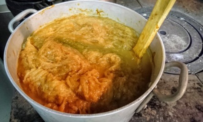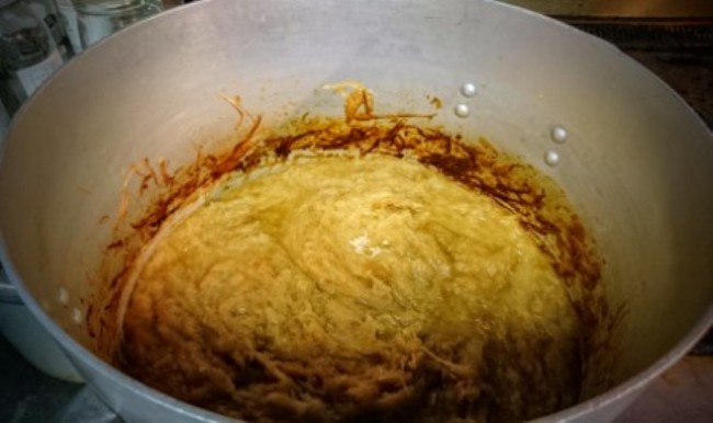 それを紙のように薄く切ります。これがまた時間かかります。でも1個に1分はかからないくらいですけどね。最初はお店で2番目にでかい鍋(約30リットル、直径約40センチ高さ25センチくらい)に八文目くらいですね。上の画像は半日くらい火にかけた様子です。極超弱火でやるので3日か4日かかります。