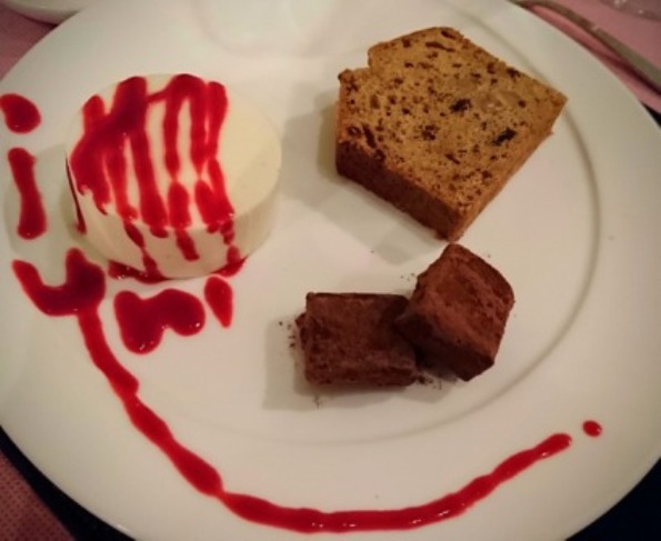 Mousse glacee de poire et coulis de framboises , Cake aux marrons et noisette roti , Pave de chocolat au cointreau 洋梨のムースグラッセ、木いちごのクーリ添え、 栗とローストヘーゼルナッツのケーキ、 コアントロー風味の生チョコ