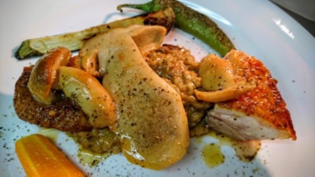 Cuisse de poulet de HINAI avec risotte aux cepes sec et frais. 比内鶏のもも肉のポワレ、 ドライポルチーニとフレッシュポルチーニのリゾット添え