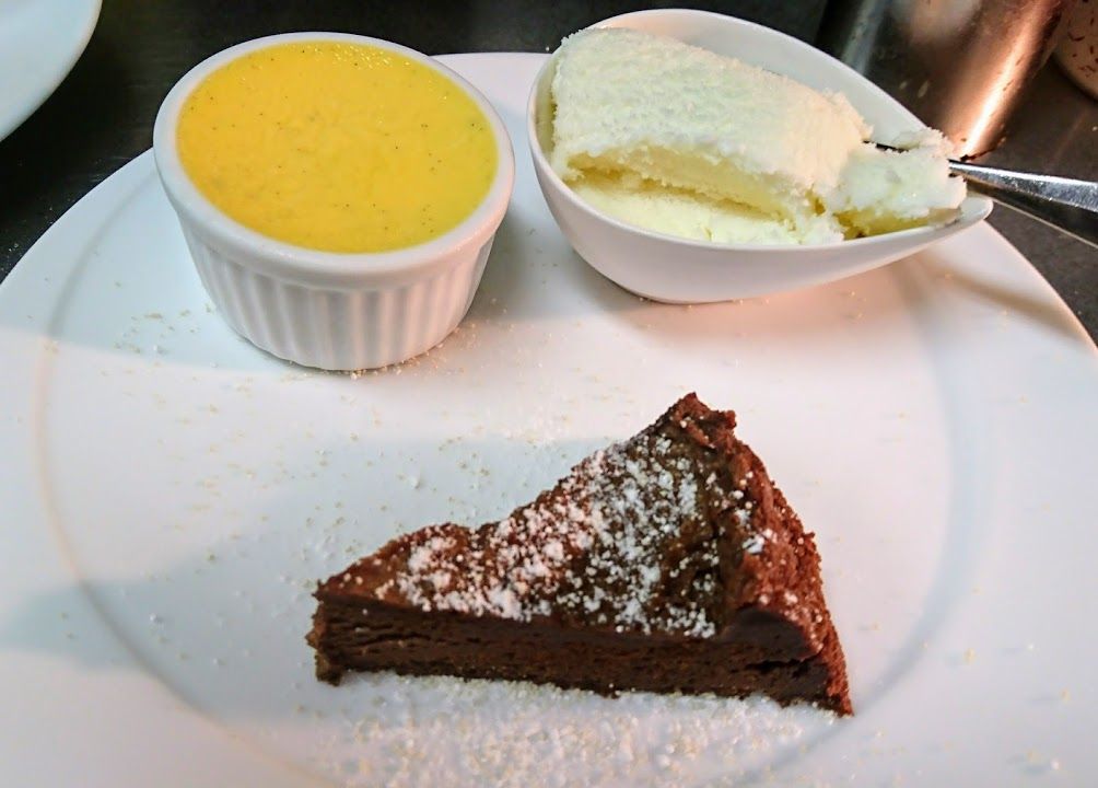 デザートは定番のガトーショコラとヴァニラのプリンと蜂蜜とミルクのソルベです。