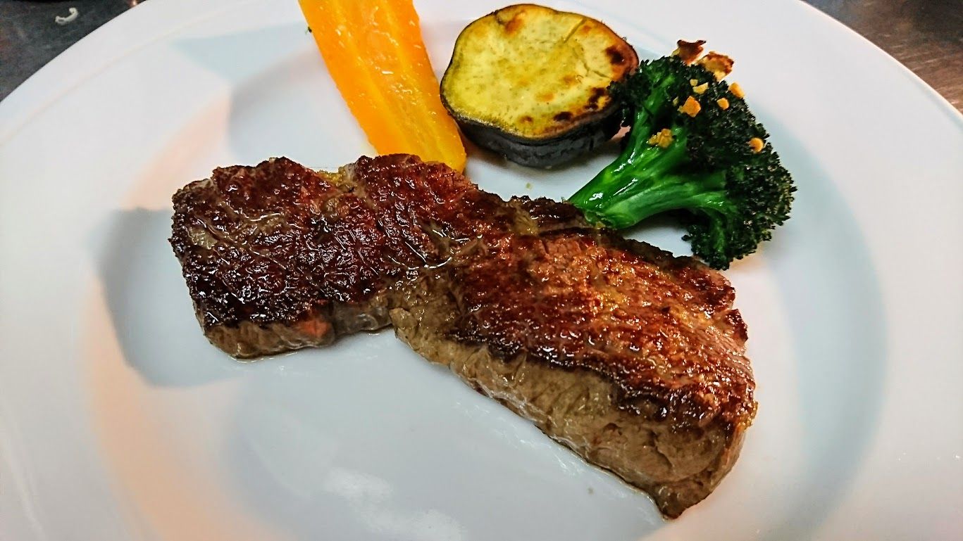 メインはバヴェットステーキです。バヴェットというのは牛肉の部位の名で、直訳するとよだれ掛けという意味ですが、牛のヒレ肉とバラ肉の間にあります。ヒレ肉の柔らかさと腹身肉やサーロインの旨味を併せ持ったような赤身肉でフランス人がステーキ肉としてとても好む部位です。パリにはバヴェットステーキの専門店があるほどです。牛1頭で10キロも取れない希少部位でもあります。ジューシーで赤ワインによく合いますよ!